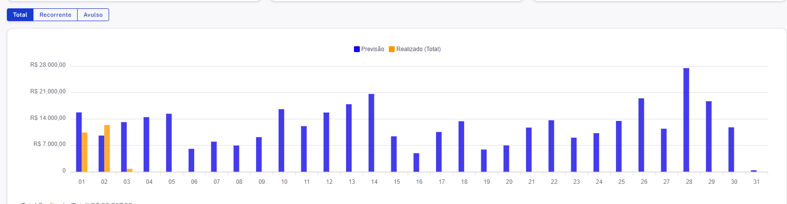 Barras azuis: representam o faturamento previsto (somente faturas recorrentes com vencimento naquele dia)