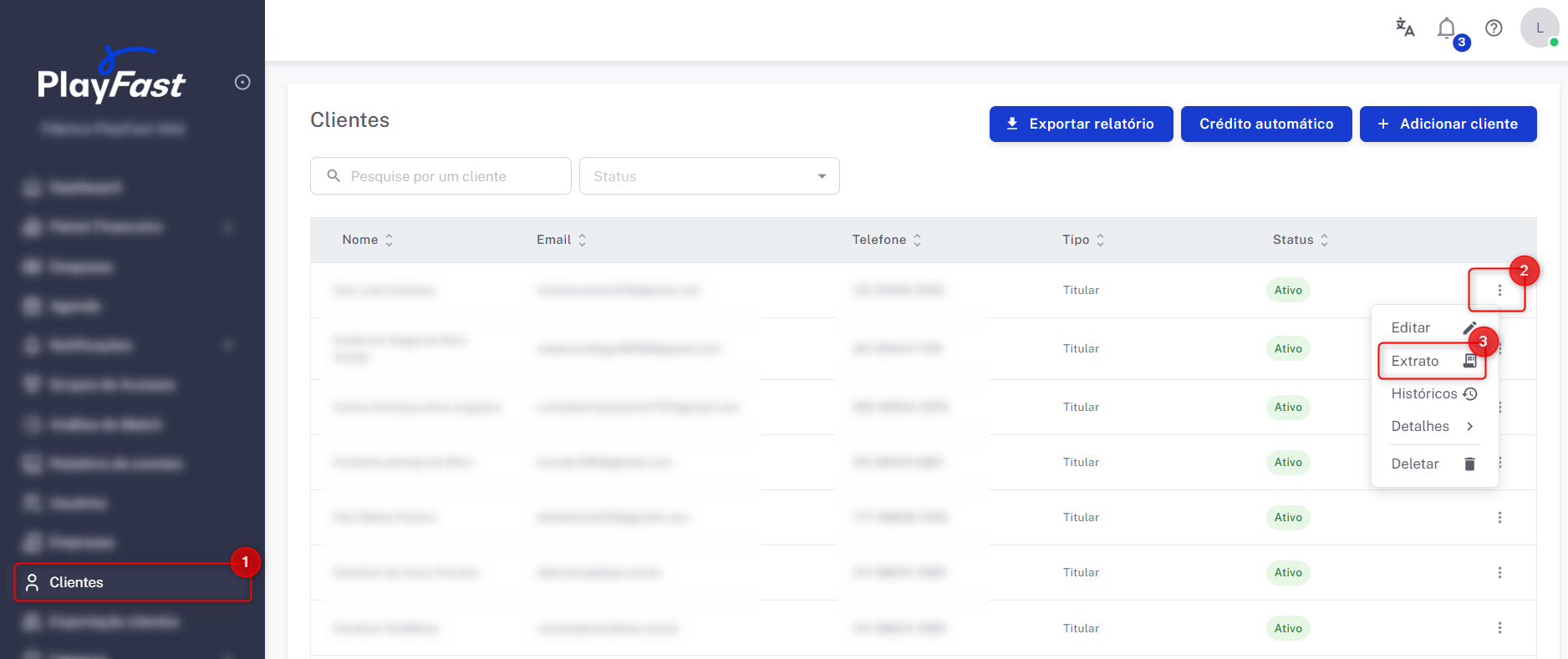O Extrato de Crédito é uma ferramenta essencial da PlayFast que permite ao gestor visualizar todas as movimentações de créditos realizadas por um cliente, independentemente da origem.
