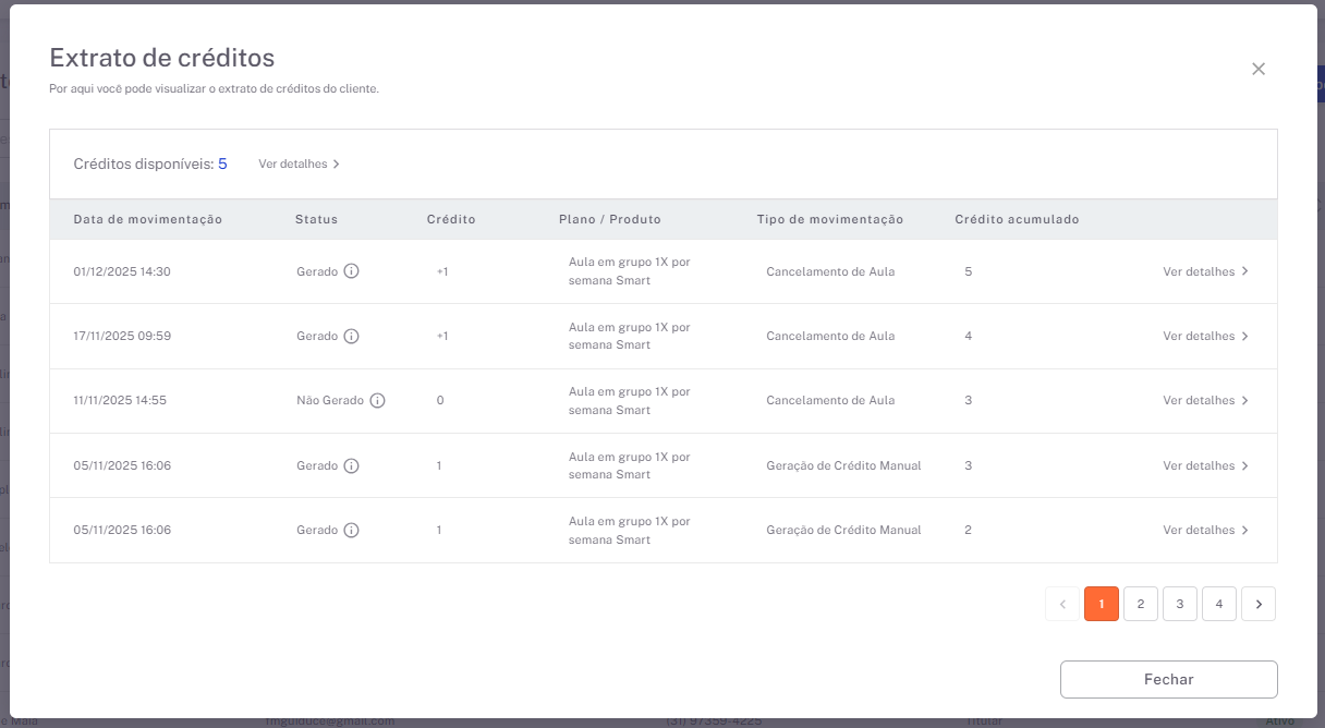 O extrato fornece uma visão clara, organizada e completa da relação de créditos do cliente com a unidade, garantindo transparência tanto para o gestor quanto para o próprio cliente.
