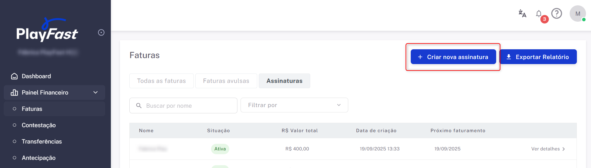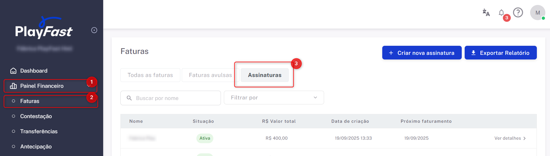 No menu lateral da Play Fast, clique no menu Painel Financeiro e logo sem seguida, selecione o submenu Faturas