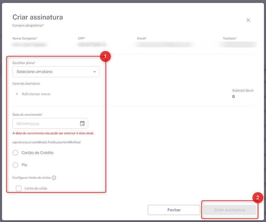 Limite de ciclos: Define por quantos meses aquela assinatura irá estar vigente
