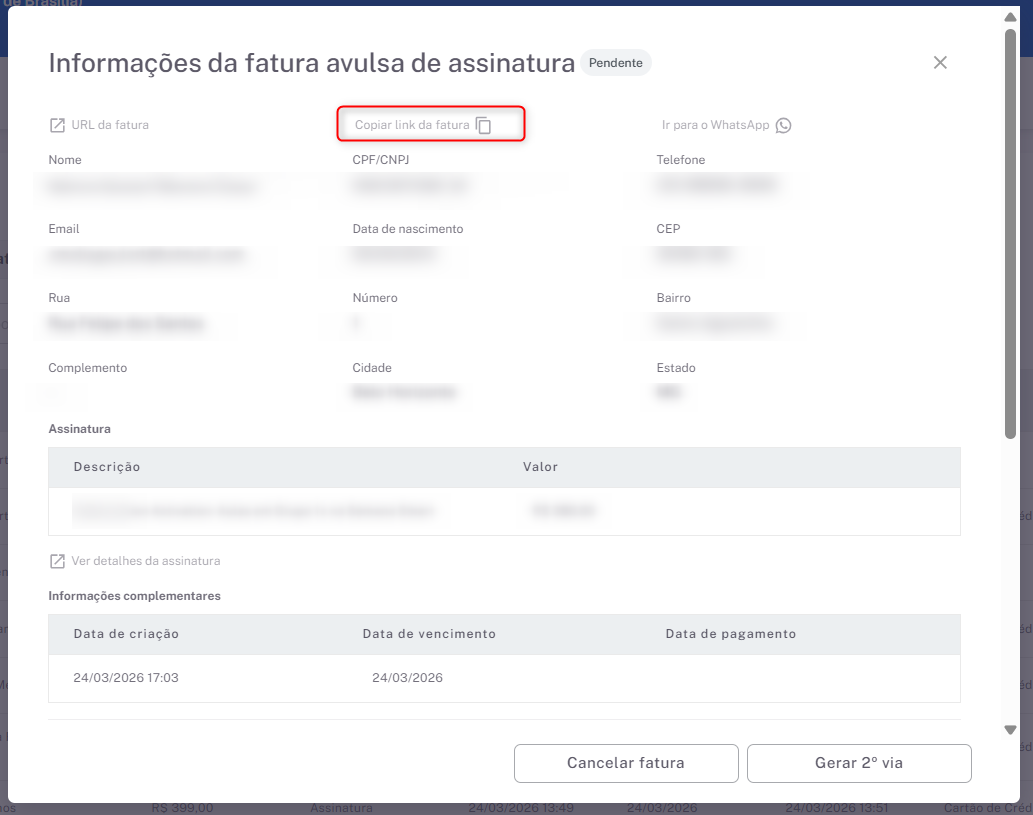 Faça o envio do link de pagamento da fatura para o cliente