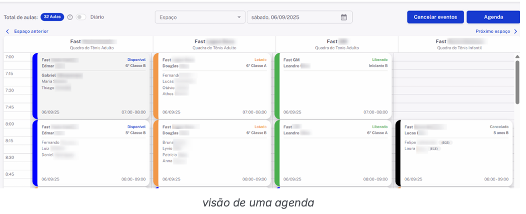 É nela que o gestor visualiza todas as aulas, locações e eventos, identifica disponibilidade de espaços, confere professores e controla a ocupação das quadras.