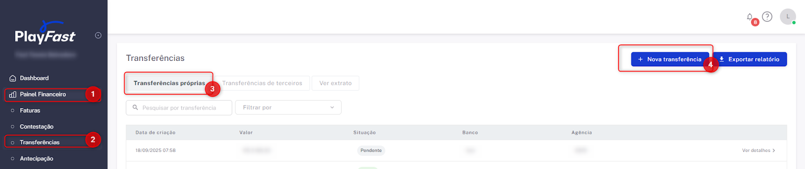 A transferência própria é uma forma rápida e segura de movimentar o saldo disponível no sistema para a conta da própria empresa.