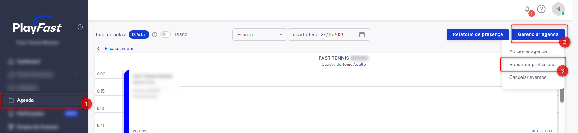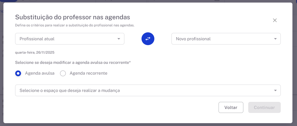Com ela, é possível realizar substituições pontuais ou recorrentes com poucos cliques, mantendo toda a operação organizada e alinhada — sem necessidade de editar agenda por agenda manualmente.