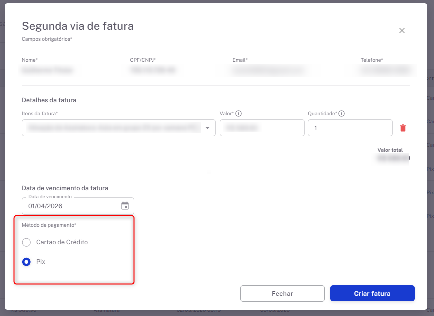 Logo em seguida, alterar a forma de pagamento para o PIX e salvar fatura.