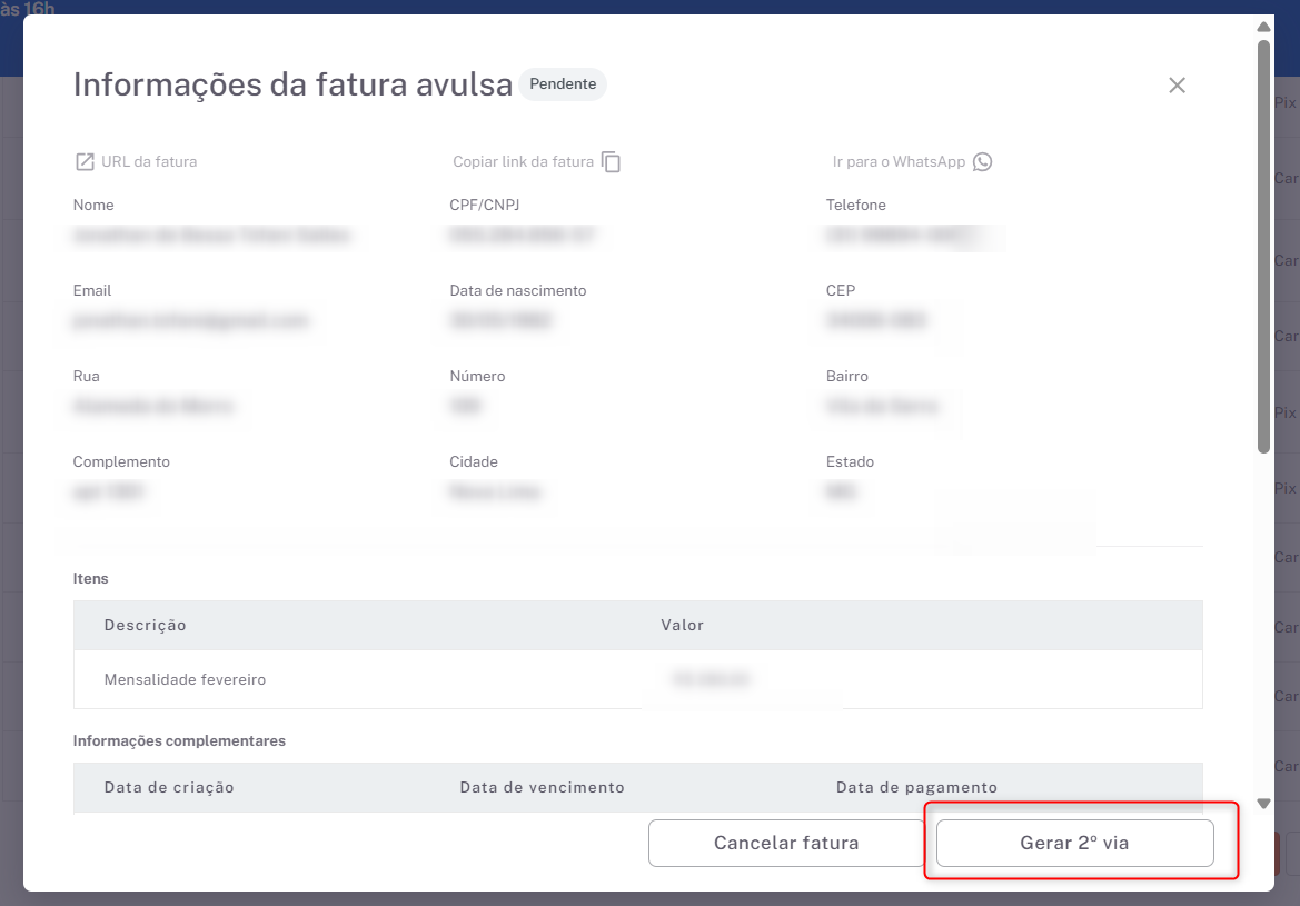 Visualize o detalhe da fatura e selecione a opção de "Gerar segunda via" da fatura